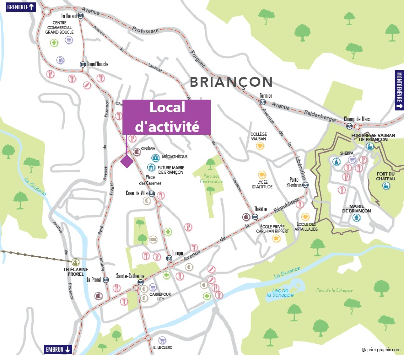 Situé au pied d'une toute nouvelle résidence de prestige au cœur de ville de Briançon où l'architecture se distingue par son design élégant et ses finitions de qualité, le local commercial que nous vous proposons est à seulement 300 mètres des remontées mécaniques du Prorel, à proximité des commerces, du marché (bihebdomadaire), de la médiathèque, du cinéma et des hôtels du centre-ville.